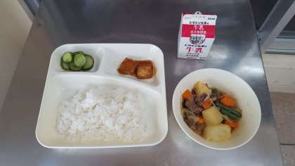 今日の献立は、肉じゃが・厚揚げのみそだれかけ・あっさりきゅうり・ごはん・牛乳です。