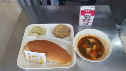 今日のメニューは、チキンレバーカツ・ケチャップ煮・キャベツのバジル風味サラダ・コッペパン・マーマレード・牛乳です。