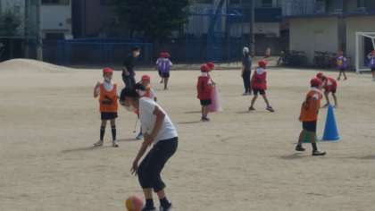 2年生の体育の授業の様子です。運動場でボールを使ったゲームの試合をしていました。みんな一生懸命にボールを追いかけていました。