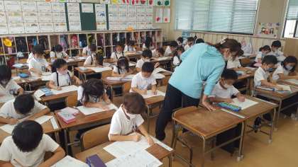 1年生の国語の授業の様子です。「っ」の入った言葉のプリントをしていました。「きっぷ・きって」を知らない子が多くいました。使う機会が減っているからかもしれません。