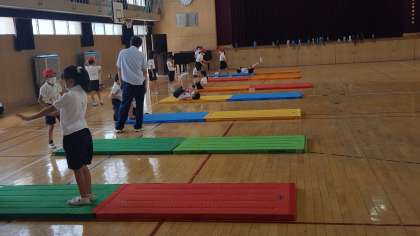 3年生の体育の授業の様子です。講堂でマット運動をしていました。後転の練習をしていました。前転に比べると難しいです。がんばりましょう。