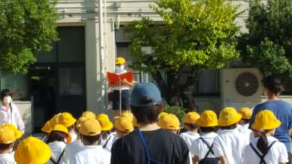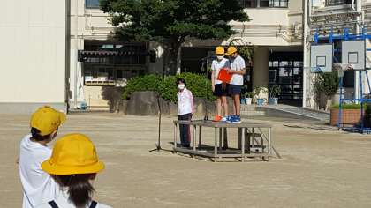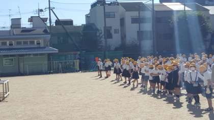晴天の下運動場で全校朝会を行いました。校長先生から秋の交通安全運動の話がありました。