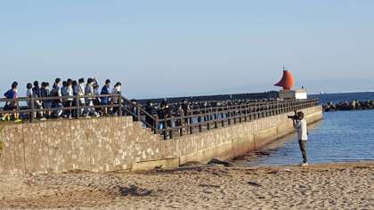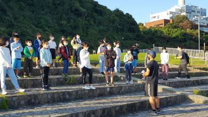 お早うございます。爽やかな風が吹き抜けるいい天気です。みんな元気です。朝の集いの様子です。その後海辺の散策をしました。