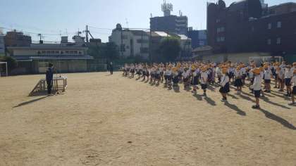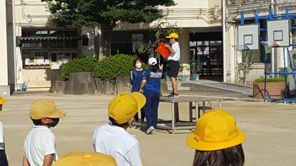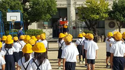運動場で、全校朝会を行いました。5年生は、チャレンジ海体験の代休でお休みでした。校長先生のお話の後、看護当番から先週の反省と今月・今週の目標についての話がありました。