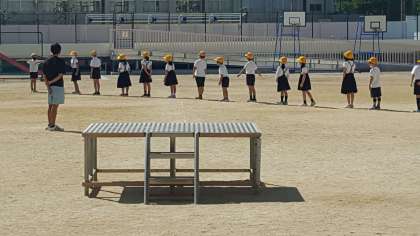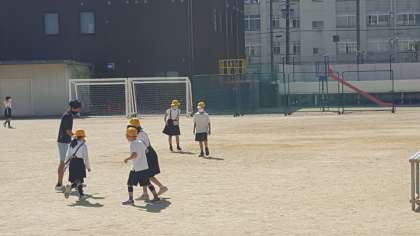 3年生の理科の授業の様子です。かげのでき方について運動場で観察していました。かげの方向に1列で並んだり、かげふみをしていました。