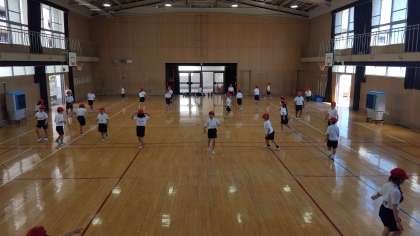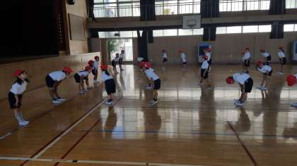1年生の体育の授業の様子です。講堂でいろいろな動きに挑戦していました。