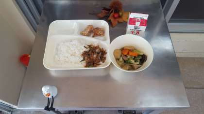 今日の献立は、鶏肉の竜田揚げ・おかか菜っ葉・一口がんもと野菜の煮物・ごはん・牛乳です。