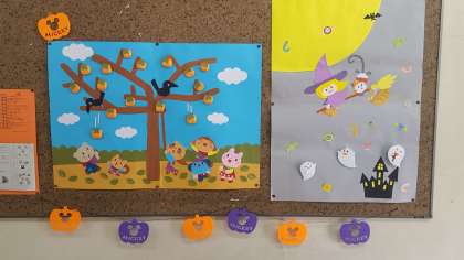 10月の給食室の掲示です。ハロウィンは日本でも、10月の風物詩になりましたね。
