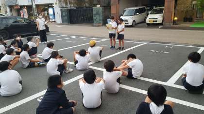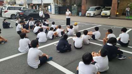 避難訓練をしました。集合した後にお風呂係から、注意がありました。