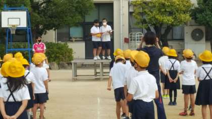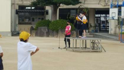 運動場で全校朝会を行いました。校長先生のお話の後、看護当番から先週の反省と今週の目標についての話がありました。