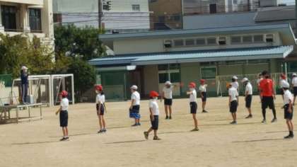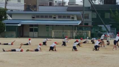 5・6年生の体育の授業の様子です。運動場で運動会の練習をしていました。えんじるいちを確認しながら体を動かしていました。雨が早く上がり運動場が使えてよかったです。