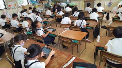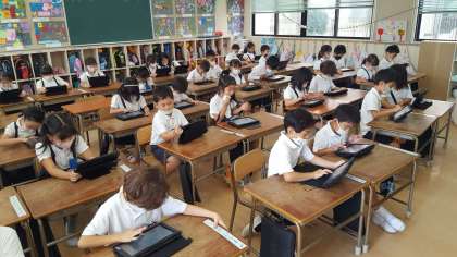 1年生の図画工作の授業の様子です。タブレット端末のピクチャーキッズを使って作品を作っていました。タブレット端末使いこなす姿にびっくりしました。