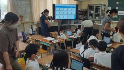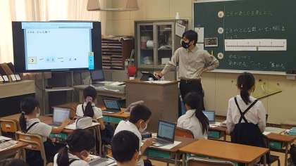 本日3年1組で授業研究会を行いました。教科は算数、小数の単元でした。子ども達は、パソコンを使って自分の考えを発表していました。子ども達の頑張りが伝わってくる授業研究会でした。