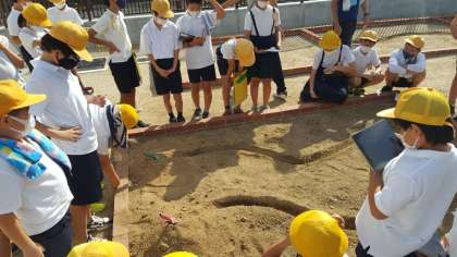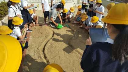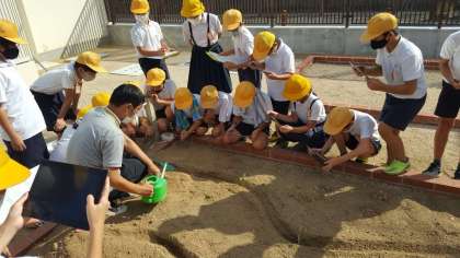 5年生の理科の授業の様子です。花壇を使って流れる水の働きの実験をしていました。パソコンで動画の撮影もしていました。