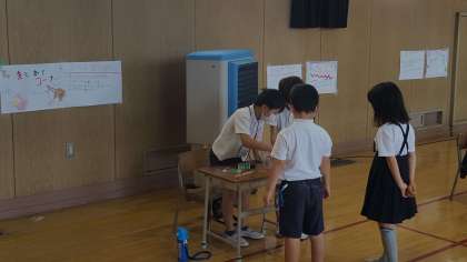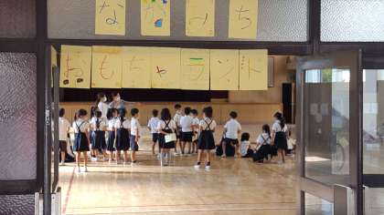 2年生が手作りおもちゃのお店を開き、招待された1年生がお店で遊ぶという授業です。どちらの学年にとっても楽しい授業です。