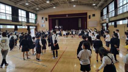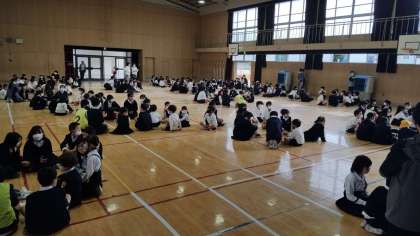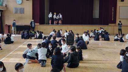 講堂で児童集会を行いました。今日はクイズでした。班で答えを考えていました。ほとんどの班が全問正解でみんなから称賛されました。