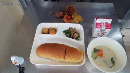 今日のメニューは、白菜のクリーム煮・厚揚げのごまじょうゆかけ・豚肉とサンド豆のオイスターソース炒め・おさつパン・牛乳です。