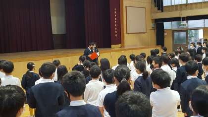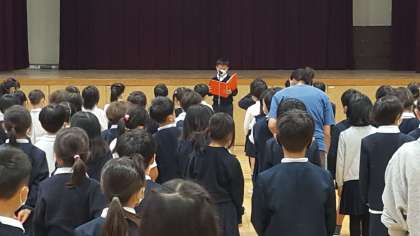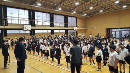 雨のため講堂で全校朝会を行いました。校長先生のお話の後、看護当番から先週の反省と今週の目標についての話がありました。運動会の準備が着々と整ってきましたが、今日は雨が降り続くとのことなので、静かに過ごしましょう。