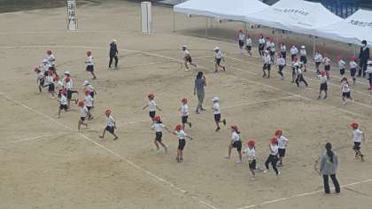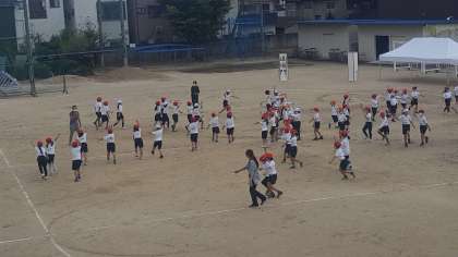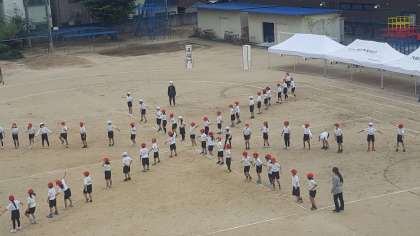 1・2年生の体育の授業の様子です。運動会のダンスの練習の様子です。今日は隊形の移動を中心に練習をしていました。列をそろえていどうするのはむずかしいですが、うまくできるととても綺麗です。がんばりましょう。