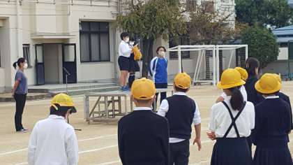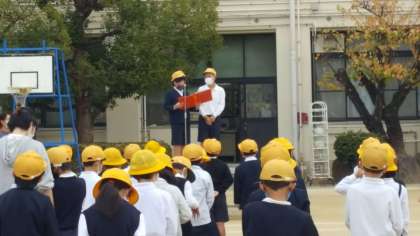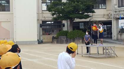 本日運動場で全校朝会を行いました。校長先生のお話の後、看護当番から先週の反省と今週の目標についての話がありました。続いて、代表委員会よりお知らせがありました。