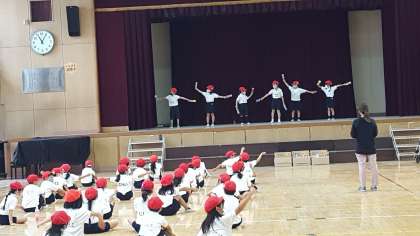 1年生の体育の授業の様子です。講堂でダンスの披露をしていました。みんなとっても上手でした。