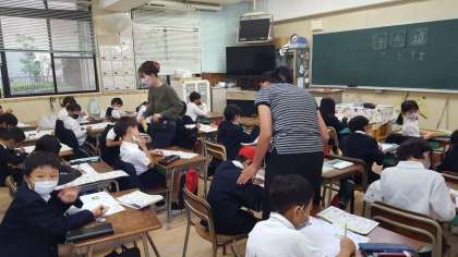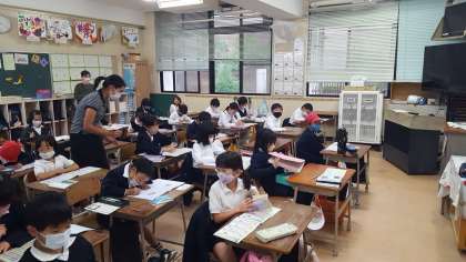 2年生の国語の授業の様子です。2年生も新出漢字の学習をしていました。漢字ノートにていねいに書いていました。机間巡視で、先生が1人ずつ丸をつけていました。