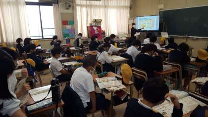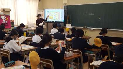 6年生の英語の授業の様子です。食材について考えていました。冷蔵庫にある食材を英語で話していました。おなじみのものもありますが初めて出てきたものもありました。しっかり覚えておきましょう。