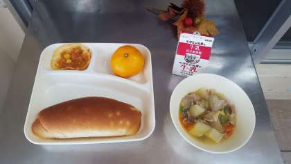 今日のメニューは、豚肉と野菜のスープ煮・変わりピザ・みかん・おさつパン・牛乳です。