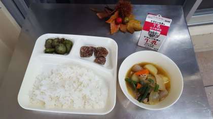 今日の献立は、クジラの竜田揚げ・きゅうりの赤じそあえ・豚肉とジャガイモの煮物・ごはん・牛乳です。