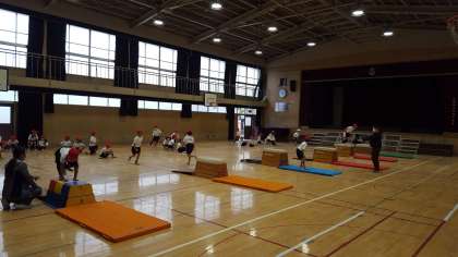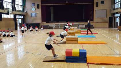 1年生の体育の授業の様子です。講堂で児童とび箱の学習をしていました。跳び越すためには、基本的な動きが大切です。基本に忠実にがんばりましょう。