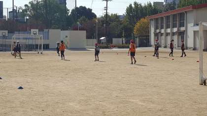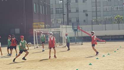 6年生の体育の授業の様子です。サッカーの試合をしていました。秋晴れの爽やかな風の吹く中、みんな楽しそうに体を動かしていました。