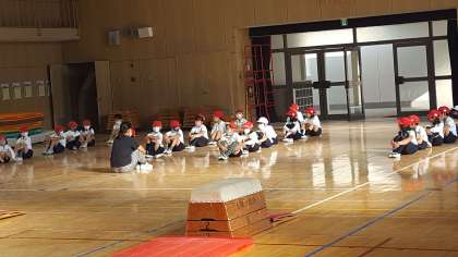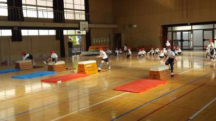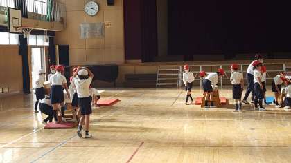 2年生の体育の授業の様子です。講堂でとび箱を使った運動をしていました。とび箱の準備から跳ぶときのルール、片付けの仕方を確認して運動を始めました。