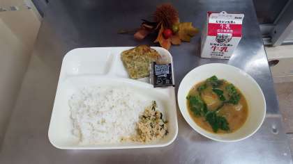 今日の献立は、お好み焼き・豚汁・とり菜っ葉炒め・ごはん・牛乳です。