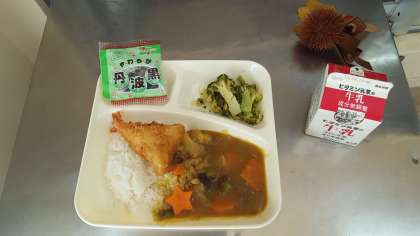 今日の献立は、エビフライカレーライス・ブロッコリーのサラダ・ソフト黒豆・牛乳です。