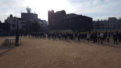本日運動場で全校朝会を行いました。校長先生のお話の後、看護当番から先週の反省と今週の目標についての話がありました。