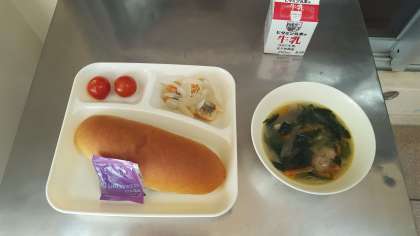 今日のメニューは、鮭のマリネ・肉団子と麦のスープ・プチトマト・コッペパン・ブルベリージャム・牛乳です。