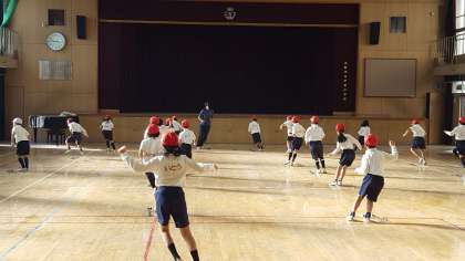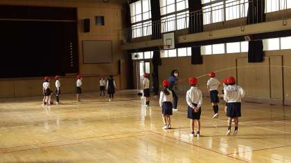 2年生の体育の授業の様子です。講堂で縄跳び運動をしていました。短縄・長縄を使っていろいろな跳び方にチャレンジしていました。とても楽しそうでした。