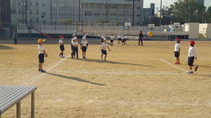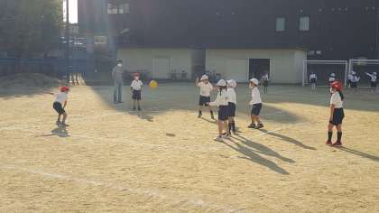 1年生の体育の授業の様子です。運動場でボールを使った運動をしていました。ボールを投げたり、受けたりするゲームでした。ボール運動はすればするほど上達します。休み時間にも運動場でボールを使いましょう。