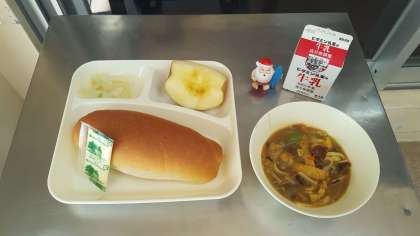 2学期の最終の給食です。今日のメニューは、カレーうどん・白菜の甘酢あえ・りんご・コッペパン・ソフトマーガリン・牛乳です。