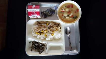 今日は、お正月の行事献立です。れんこんのちらし寿司・お雑煮・ごまめ・牛乳です。
