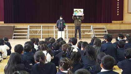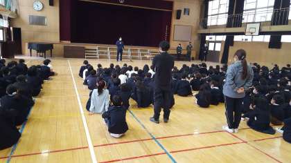 2校時に不審者対応の避難訓練を行いました。東成警察署の方に来校いただいて実施しました。不審者が確保されるまで教室で閉じこもり、確保後に講堂に避難しました。
