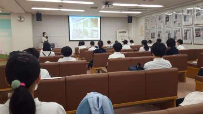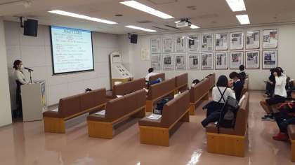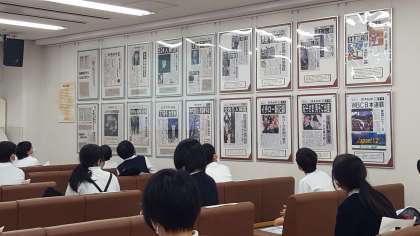 見学を終え、社内見学のDVDを見ました。壁には過去の号外がたくさん掲示されていました。