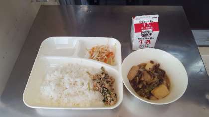 今日の献立は、すき焼き煮・ツナっ葉炒め・もやしと人参の甘酢あえ・ごはん・牛乳です。