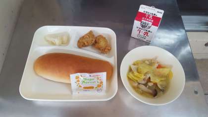 今日のメニューは、白身魚フリッター・洋風煮・カリフラワーのサラダ・コッペパン・アプリコットジャム・牛乳です。