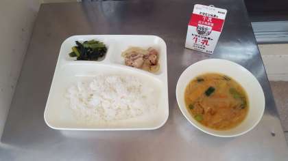 今日の献立は、鶏肉のゆず塩焼き・みそ汁・小松菜の煮びたし・ごはん・牛乳です。