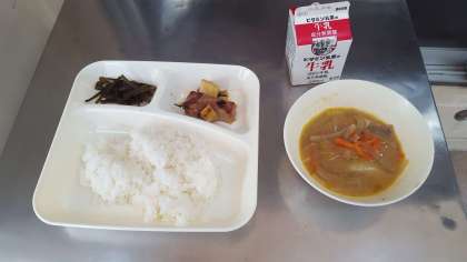 今日の献立は、マグロの甘辛焼き・豚汁・くきわかめのつくだ煮・ごはん・牛乳です。