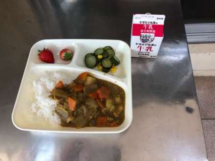 今日の献立は、チキンレバーカレーライス・きゅうりとコーンのサラダ・いちご・牛乳です。