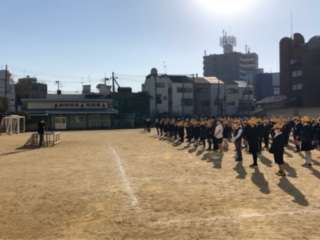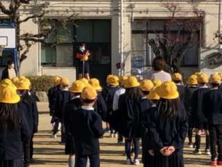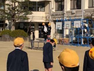 春を思わせる好天の中、運動場で全校朝会をを行いました。校長先生のお話の後、看護当番から先週の反省と今週の目標についての話がありました。