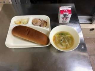 今日のメニューは、豚肉のガーリック焼き・スープ・カリフラワーとコーンのサラダ・黒糖パン・牛乳です。