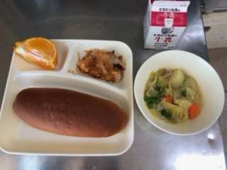今日のメニューは、豆腐のミートグラタン・おしむぎと野菜のスープ煮・デコポン・黒糖パン・牛乳です。